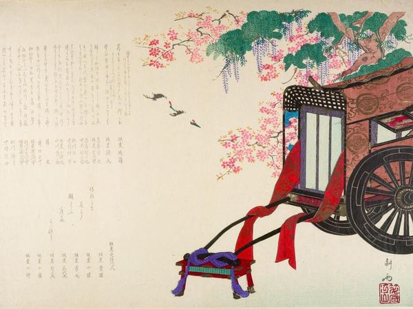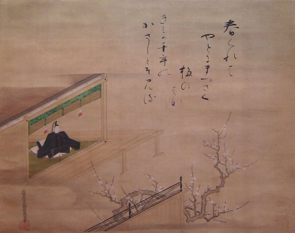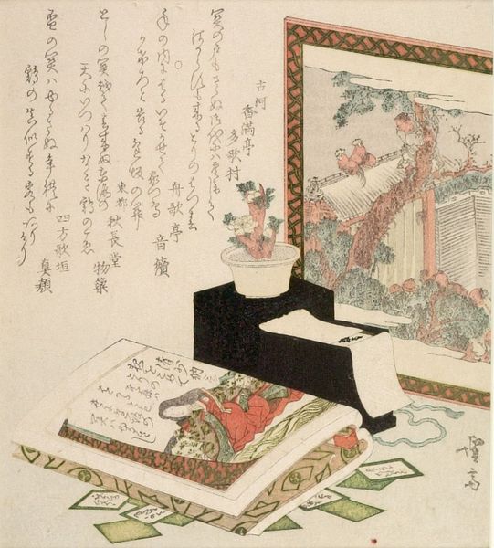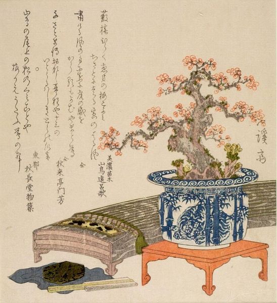 Curator: At first glance, this print evokes a sense of quiet contemplation. Editor: The work before us is Keisai Eisen's "Flower Arrangements," undated but created in the first half of the 19th century. It's a shikishiban woodblock print, a smaller format, now housed at the Harvard Art Museums. Curator: The arrangements themselves are so carefully posed. The bonsai, especially, feels very symbolic, a representation of longevity and refinement. Editor: The plants, juxtaposed with the calligraphy, reflect a cultivated sense of taste associated with privilege. They evoke questions of class, gender roles, and who has access to such refined pursuits. Curator: The text, integrated seamlessly into the composition, suggests the cultural importance of poetry and literacy alongside visual aesthetics. It speaks to a culture steeped in symbolism. Editor: Agreed. Eisen's floral arrangement points to the complex ways in which art and social hierarchy intersect and shape each other.