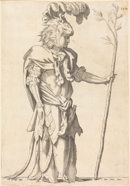 Editor: Here we have "Torch Bearer," an engraving made between 1525 and 1600 by René Boyvin. It's incredibly detailed, almost overwhelming. The figure is just packed with ornamentation. How would you begin to unpack this piece? Curator: The intricacy is certainly the first element that strikes the eye. Consider how the linear quality of the engraving emphasizes the textures, from the feathery headdress to the scale-like shoulder covering and the tassels around his waist. Do you notice how Boyvin has used line density to create a sense of volume and shadow, even without traditional shading techniques? Editor: Yes, the sheer volume of lines creates depth. It feels very stylized. Is that a conscious choice, or reflective of the time? Curator: Undoubtedly, the stylistic choices speak to Mannerism. Focus on how the figure's pose, the contrapposto, elongates the form. And consider the self-conscious artificiality in the abundance of decorative elements. The lines become a means of construction. What do you make of the props that he holds? Editor: One’s an actual torch, the other, more ornamental and made of leaves, almost like a scepter, I guess. He’s loaded with visual weight, the weight of all that ornamental detail. What do you think the torch symbolizes, beyond the obvious light? Curator: The torch and leafy branch provide balance, a duality, suggesting that Boyvin, in his structural composition, sought harmony of visual balance and perhaps conceptual oppositions through the composition, line work and ornamentation. The density draws us in and asks us to spend time to consider and compare the visual textures. Editor: That’s a great observation; breaking it down this way really clarifies the relationship between the figure, the style and symbolic choices. Curator: Exactly. The meticulous artistry, intricate lines and textural quality invites us to observe and think critically about semiotics and the use of symbols for communication through art.