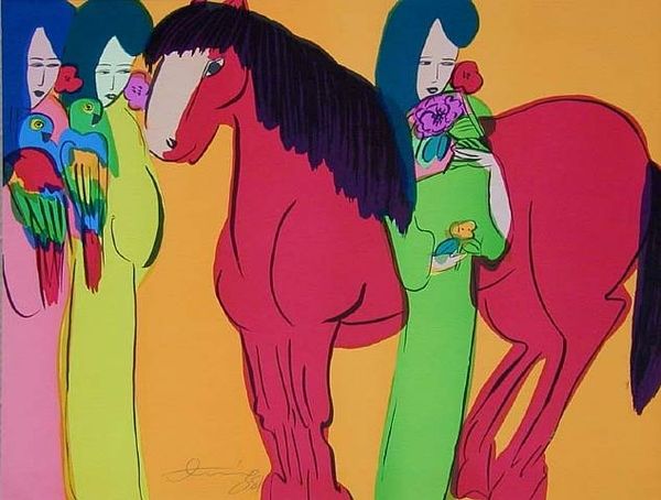 Curator: Welcome. We are looking at "Folklore Kerala - I," a painting by M.F. Husain, known for his modernist and somewhat folk-inspired approach. Editor: The first thing that strikes me is the vivid colour palette—so bright, with bold, unmodulated swathes of paint creating flat planes. The composition feels almost graphic in its simplicity. Curator: Indeed. It reminds one of the rich cultural tapestry of Kerala, where elements of folk art, performance, and ritual intermingle. Husain often drew inspiration from the local narratives and mythologies of India. Notice the array of brightly hued elephants dominating the scene. They serve as symbols. Editor: Their simplified, almost cartoonish forms contribute to the artwork's naivete, but are there signs of abstraction as well? I think that is fascinating! They are also varied, though linked in a rhythm across the picture plane. The solitary figure in the boat seems like an anchor for these beasts. Curator: Yes. I read the figure on the boat as an essential piece of the social fabric—perhaps a reference to local fisherman navigating the waterways or local legends that tell the story of Kerala. Husain had deep ties to the Indian Progressive Artists' Group, who often challenged colonial art's impact on national identity and sought to depict modern India through the lives and work of ordinary people. Editor: It also is rather flattening of perspective. Curator: Absolutely. The work engages with the postcolonial moment, attempting to capture, archive and reflect the spirit and culture of the region through both recognizable and distorted figures. Editor: Now seeing more and reflecting, it appears a blend of surface and symbol, as well as meaning making—where tradition finds abstraction. Curator: So in reflecting, while our perspectives differ, ultimately the piece makes a cultural contribution!