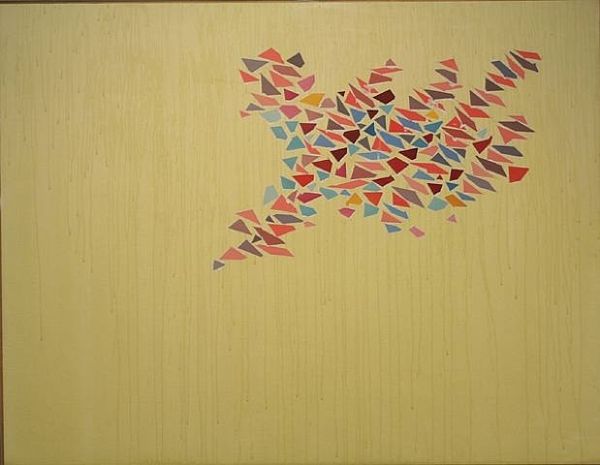 Robert Goodnough made this untitled painting with blocks of acrylic on canvas. It's like he's playing with mosaics, but instead of tiles, it’s paint. The background has these vertical streaks, watery blues and greens, which make the clusters of colored shards float. Look at that red shape near the bottom – it’s not quite a star, not quite a flower, but something in between. Each of these shapes are made up of smaller polygonal marks. It’s like looking through a kaleidoscope! Goodnough reminds me a bit of Joan Miró, with his playful abstraction and bright colors. But where Miró feels like pure fantasy, Goodnough keeps one foot in the real world, like he's capturing a fleeting moment, a gust of wind scattering leaves. There's an ongoing conversation between artists, remixing ideas and approaches, and Goodnough’s painting is another voice in that chorus.