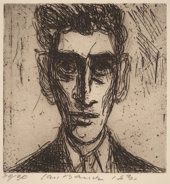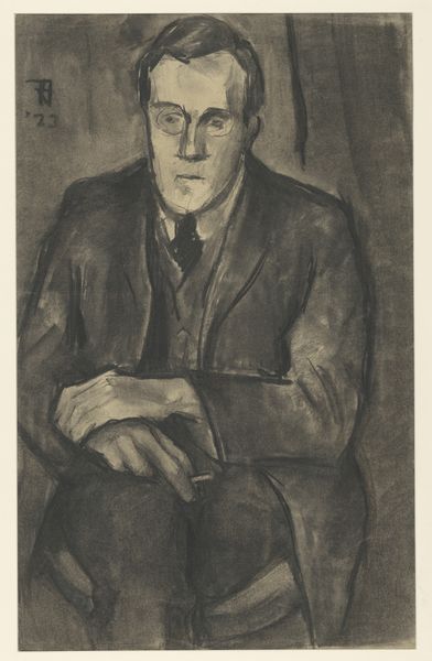 Curator: Here we have Henk Henriët's "Portret van een zittende man," or "Portrait of a Seated Man," believed to have been created sometime between 1918 and 1945. Editor: My immediate impression is one of quiet contemplation. The muted tones of the pencil create a very introspective mood. I'm drawn to the angles in his face and how the composition directs our eye. Curator: It’s fascinating how the artist renders a very realistic depiction using only pencil. Think about the availability and affordability of drawing materials in the early to mid-20th century. The choice speaks volumes about access and artistic resourcefulness, doesn’t it? Editor: Absolutely. The varying pressures and techniques used with the pencil – notice the hatching and cross-hatching – it's clear Henriët was skilled in leveraging these basic tools to create a range of tonal values and textural effects. We could analyze the semiotic play in representing a formal subject with a simple technique. Curator: And what does that choice to depict a seated man in what appears to be business attire – a suit, tie and buttoned shirt– tell us? His posture, with arms crossed, speaks to both confidence and perhaps a hint of defensiveness or reserve. Maybe we could unpack this drawing in context of the modernization and shift of social values prevalent in the Netherlands during that period? Editor: That's a great angle. I’m more focused on how the interplay of light and shadow models form to create depth on a 2D surface. The textures of the jacket versus the tie versus the skin…all rendered with such precision with limited tool, really exemplifies formal artistry here. It pulls us beyond historical contextualization toward universal questions about form and essence. Curator: Perhaps. Either way, understanding the production is key; considering pencil's ubiquity, Henriët's decision to create with such available medium lends meaning to how accessibility and materials influenced modern art production overall. Editor: Indeed, this analysis only enriches one’s interpretation. So, ultimately it blends process, material, context, composition, form, and mood into an experience of “Portret van een zittende man”.