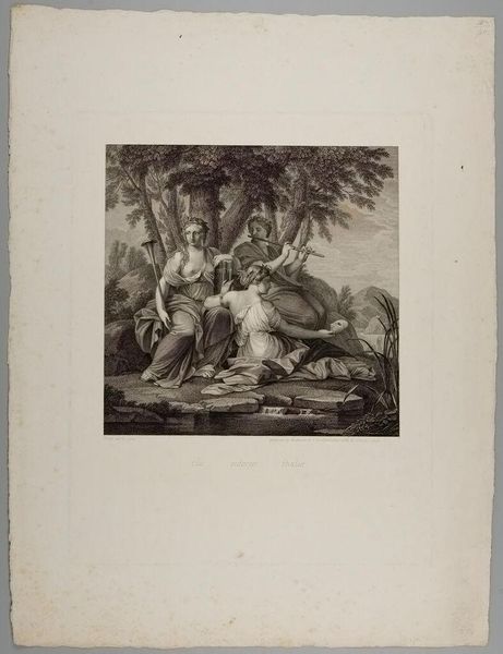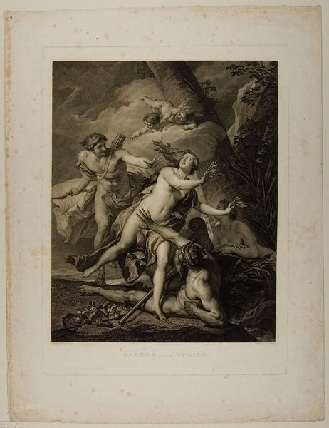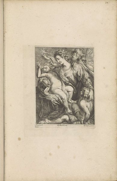 Curator: Pieter Tanjé’s print, "Mars Tramples Silenus Under Foot, and Turning His Back to Venus, is Crowned by Victory in Spite of Envy," certainly presents a complex scene. I’m particularly struck by the dynamism in the composition. What captures your attention? Editor: I’m intrigued by the stark contrast between the muscular Mars and the figures of Venus and Silenus. It feels very intentional. How do you interpret this contrast in terms of form and content? Curator: Note how Tanjé uses chiaroscuro to emphasize Mars’s imposing physique. The interplay of light and shadow creates a sense of depth and volume, directing our gaze to the central figure. The textures, from the smooth skin of Venus to Mars's detailed armor, are wonderfully rendered. What effect do these visual choices create? Editor: It makes Mars the clear focal point. Thanks, I see now how the technical execution emphasizes the thematic elements. Curator: Precisely. We can appreciate how form and content intertwine.