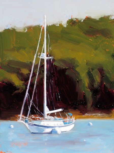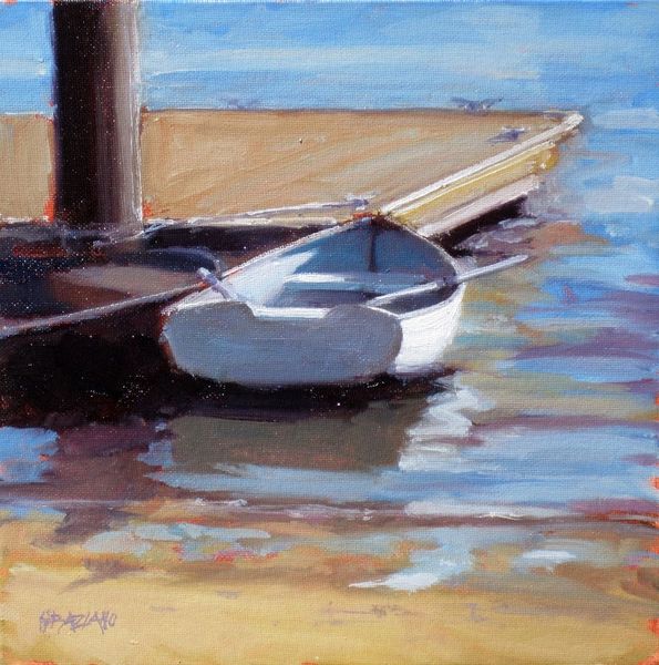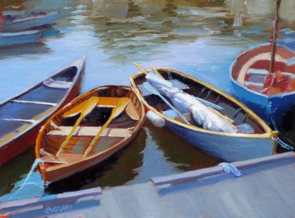 Dan Graziano painted "Summertime Repose" with oil on canvas, capturing a moment of stillness. Born in 1953, Graziano's work often reflects a deep connection to maritime life and the coastal landscape. The solitary boat, beached and at rest, evokes themes of isolation and contemplation. The bright colors might initially suggest a carefree summer scene, but there's a quiet, almost melancholic atmosphere. The boat, typically a symbol of movement and adventure, is grounded, perhaps mirroring a pause in life's journey. The painting invites us to consider the relationship between leisure and labor, particularly in coastal communities where fishing and seafaring are central to identity and survival. Who owns this boat? What stories does it carry? The artwork prompts us to reflect on our own experiences of rest and the societal structures that shape our access to it.