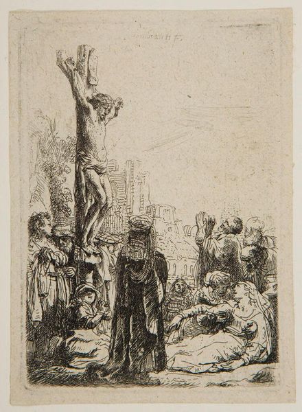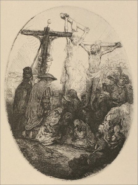 Curator: Standing before us is Rembrandt van Rijn's 1653 print, "The Three Crosses." It’s an etching, a technique where lines are incised into a metal plate with acid to hold ink. The museum purchased it fairly recently. What's your first impression? Editor: Utter darkness, really. Then, bam! Light explodes from above, concentrating on the central figure. It’s… melodramatic, theatrical, yet undeniably powerful. Curator: "The Three Crosses" is not merely a religious scene but a deeply layered narrative operating on multiple registers. Its history resides as much in 17th-century Dutch theological debates as it does in how later socio-political upheavals shaped perceptions of divine authority. Editor: So you’re saying this etching isn't just about what’s depicted, but the ongoing relationship between belief systems and worldly power? It makes you wonder about the politics embedded in chiaroscuro, the extreme contrasts he favors so strongly. Curator: Exactly. Think of it this way: Rembrandt's choices – in light and dark, the detailed rendering of some figures against the obscured masses of others – reflect an ideological landscape, not just an aesthetic one. What does it say about the relationship between power, marginality, and visibility? Editor: Good point! We're accustomed to seeing these biblical stories aggrandized but this has this underlying griminess and a focus on how collective action allowed injustice. The shadows allow for critique of the complicity. It forces a difficult confrontation with themes of power and marginalization. Curator: And think about the context in which this piece came into the collection and why people would invest so deeply into what may first look like a simple image? The narratives art sustains aren't static, and its socio-cultural impact only deepens with time. Editor: Ultimately, "The Three Crosses," in all its somber beauty, feels less like a completed declaration and more like an invitation – or perhaps a demand – to confront uncomfortable truths about humanity's failings and our role within collective action.