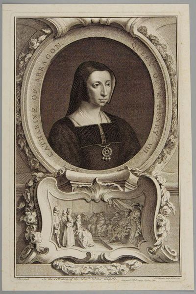 Curator: Here we have Jacob Houbraken’s 1743 engraving, "Portret van Louise van Savoye," housed right here at the Rijksmuseum. Editor: It’s arresting; a kind of formal austerity is offset by the ornate detail work. Everything seems incredibly precise and considered. The way the light catches the lower frame. It makes the entire engraving seem so carefully constructed. Curator: Indeed. Consider the circumstances surrounding Louise of Savoy. This wasn't just about aesthetics, it was a visual statement, power codified and carefully displayed during a time when the lines of succession and gender roles were very firmly drawn and dictated political life. How does this composition and style reinforce her role within the highly stratified European society of her era? Editor: That ornate frame feels really loaded when you describe it that way! All that intricate carving implies such a specialized, skilled labor force to make a single artwork, suggesting the enormous wealth and power underpinning these types of images and portraits. Did that fabrication process become more widespread or democratized later on? Curator: Interesting question. The baroque style itself can be seen as an expression of power, especially after the Reformation, which saw religious artwork used to reassert the Catholic Church's authority, but its expression differs across nations. Look at the use of line, and light, but then also consider who was creating it, and the role the woman was playing in public life. Women in leadership often had to balance an interesting negotiation of feminine qualities versus what the people considered “leadership qualities.” The portrait captures something of this push and pull. Editor: It definitely seems to hint at those sorts of contradictions. In terms of engraving as a reproducible medium—thinking about its expanded role later on. Was this always about dissemination, or was there a sort of collecting culture or market emerging here too? How were these engravings consumed in domestic spaces or within different social classes? Curator: Exactly. And what effect did they have on shaping social perceptions? Editor: It all seems very deliberate... What begins to fascinate me are the circumstances, like you mention, of the print's making. How many impressions, what type of press, what sort of inks were used... what this object *is* starts to feel inextricably linked to who she *was*. Curator: Thank you; an extremely valuable point of entry that opens more narratives and connections within the work, allowing us to learn so much more than if we simply glanced at this striking portrait!