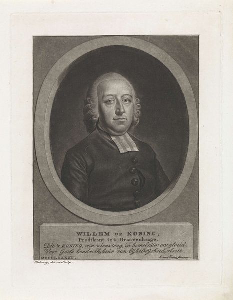 Editor: We’re looking at a portrait of Antonio Francesco Gori, an engraving by Johann Martin Bernigeroth, from 1746. I find it quite formal, very much of its time. All those lines! How would you describe it, looking at it purely from a visual perspective? Curator: It's fascinating how Bernigeroth employs line to define form. Notice the density and direction of the hatching. Around the face, these minute parallel strokes create not just shadow, but volume. Observe, too, how the artist uses contrasting densities to describe the textures, from the subject's smooth skin to the drapery of his robe. The very artifice of the engraving technique, those deliberate lines, speak volumes. Editor: So, it’s all about the lines and their arrangement? What about the oval frame and the text beneath the portrait? How do those elements factor in? Curator: Precisely. The oval functions as a contained field, intensifying our focus on the figure’s physiognomy. The inscription, a textual plane, creates a clear structural division while informing us about the sitter’s identity and station. The geometry dictates how we perceive it. We are guided purely through compositional arrangement. It speaks to the organizational structures the artist deemed necessary. Editor: It's interesting how the formal constraints become expressive in their own right. Thank you! Curator: Indeed. It reveals how much an artist can communicate solely through the control and manipulation of basic formal elements.