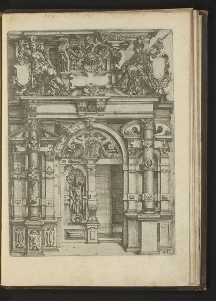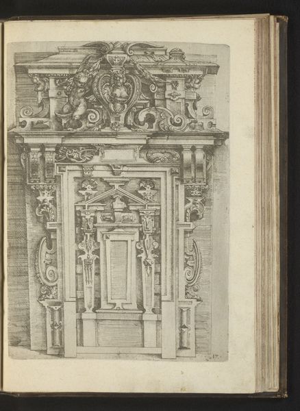 Editor: So, this is “Portaal gedecoreerd met mascarons, een triton en sfinxen,” or "Portal decorated with mascarons, a triton, and sphinxes," by Wendel Dietterlin, made between 1593 and 1595. It looks like an engraving. It’s incredible how much detail the artist packed in. What jumps out at you about this piece? Curator: The most striking element is its emphasis on the materiality of architecture. The engraving meticulously renders stone and ornamentation, but more importantly, highlights the labor and expense required to produce such elaborate designs during the late Renaissance. It almost seems a prospectus meant for upper-class patronage. Editor: So, it's about the production of art as a status symbol? Curator: Precisely. The artist isn't just showcasing his artistic skill, but also implying the significant human capital—quarrymen, stonemasons, sculptors, and their workshops—necessary to manifest these designs. How do you interpret the abundance of mythical creatures? Editor: I guess, like with most Renaissance art, it's a reference to classical antiquity meant to imbue prestige. Curator: Yes, but even this choice speaks to the labor involved. The classical motifs would require specialized knowledge and skilled artisans, adding another layer of complexity—and therefore, cost—to the creation of this idealized portal. Note how Dietterlin isn’t merely depicting architecture; he’s presenting a blueprint for conspicuous consumption and class distinction, laid bare by his focus on the material processes. It reminds us to ask, 'Who paid for this? Whose hands made this?' Editor: That’s fascinating. I hadn't thought about it in terms of the physical effort and expense involved. Curator: Thinking about art as a product of materials, labor, and economic forces truly opens up new avenues for understanding the image and its creation. Editor: Definitely. Thanks to this materialist perspective, the image resonates with much more depth.