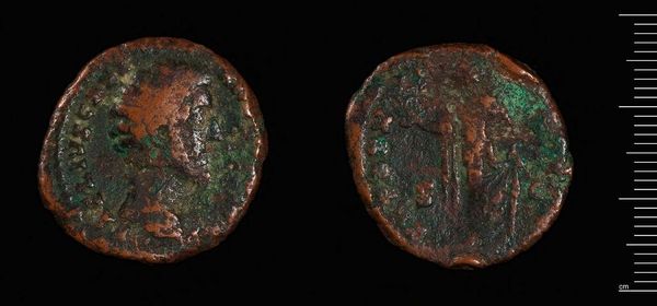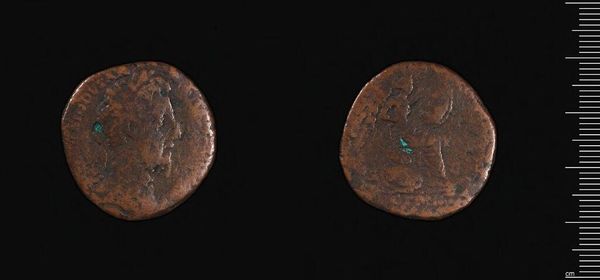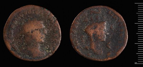 Editor: This is a bronze coin of Vima Kadphises, part of the Harvard Art Museums collection. It looks worn and aged, but still feels weighty. What can you tell me about it? Curator: This coin embodies power and cultural exchange. Consider Vima Kadphises's rule during a period of immense social stratification; his image on currency suggests a deliberate construction of authority. Editor: So the coin is a political statement? Curator: It certainly projects power, but also reveals the socio-economic realities of the time. How does an object like this reflect on contemporary power structures and our understanding of history? Editor: It makes you think about who gets to be remembered, and how. Curator: Exactly. The coin invites us to question whose stories are valued and circulated, then and now.