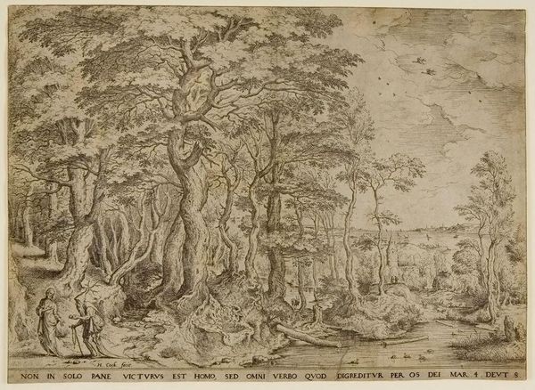 Curator: This etching, titled "Landschap met de barmhartige Samaritaan," or Landscape with the Good Samaritan, created sometime between 1600 and 1800 by an anonymous artist, offers quite a powerful visual narrative. Editor: My immediate response is one of stark contrast—between decay and compassion. The ruined architecture to the left evokes a sense of historical weight, almost abandonment. The stark details in the Samaritan's act of care feel intimate, even radical, given the setting. Curator: Absolutely. Considering the socio-political landscape of that time, the image of a "Good Samaritan" becomes exceptionally poignant. Who is deemed worthy of compassion? Whose suffering is recognized, and whose is ignored or even actively created by social structures? It urges us to consider marginalized individuals and their treatment, both historically and in our present society. Editor: I’m struck by the symbolism within the natural elements. Notice how the gnarled, old trees frame the Samaritan and the injured figure. These trees could be interpreted as symbols of endurance, or even silent witnesses to the ongoing drama of human kindness versus cruelty throughout history. Curator: And we can't overlook the formal qualities reinforcing the thematic implications. The use of etching lends itself to rendering intricate details. How this impacts representation is key here; it highlights inequalities in representation and challenges the viewer to interrogate what constitutes empathy within diverse societal contexts. The technique actively highlights detail that contributes to these social considerations. Editor: Right, the details amplify the emotional gravity. Think of the positioning of the figures themselves, or the man perched on the bridge in the mid-ground. One walks away while another pauses to look at those in distress; is that their conscious weighing the values of indifference against human concern? What might those poses be conveying? Curator: Exactly. Those nuanced, expressive figures challenge assumptions, urging greater compassion and fostering understanding among individuals from differing backgrounds. It offers a space to analyze the nuanced expressions of moral choice during this era of genre-painting. Editor: It seems that it all comes down to the cultural understanding of moral imagery, in that epoch. From this perspective, and when applied in our time, one should be motivated towards collective compassion within current geopolitical tensions. Curator: Agreed. Analyzing this anonymous piece truly prompts a thorough introspection. Editor: And provides a meaningful way to contemplate on symbols of moral conduct, while reflecting on historical inequalities.