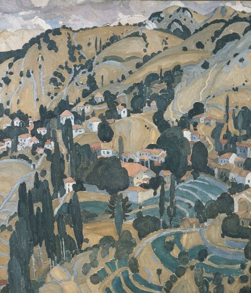 Spyros Papaloukas's Landscape presents a bird’s-eye view of a village nestled among verdant hills, rendered with a muted palette and a focus on geometric forms. The buildings are simplified into cubes and cylinders, while the trees are suggested with broad, flat planes of green. The composition, seemingly a straightforward representation, is more complex when viewed through a structuralist lens. Papaloukas plays with the contrast between organic and geometric shapes. The architectural forms, rendered in cool whites and greys, are sharply defined against the softer, undulating greens of the natural landscape. The artist destabilizes traditional landscape painting by prioritizing form and structure over realistic representation. The surface of the painting becomes a site where the signs of landscape—trees, buildings, sky—are rearranged and reconfigured. This calls into question the very idea of a fixed, objective representation, suggesting instead a subjective construction of reality. The painting's visual architecture reflects Papaloukas' exploration of modernism and its engagement with the underlying structures of perception and representation.