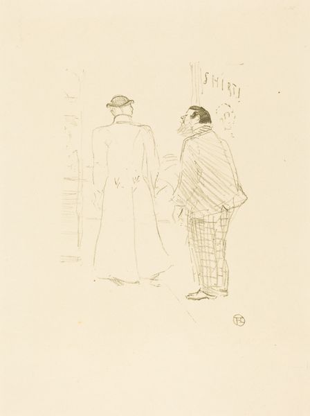 Curator: This lithograph and pen drawing on paper is titled “In the Cloakroom.” Jean-Louis Forain created it around 1897. What do you make of it? Editor: The mood is immediately heavy, no? She looks utterly defeated; the whole thing has the feeling of a very swift emotional sketch, like catching a fleeting moment. Curator: Absolutely. Forain’s style definitely aligns with impressionism, focusing more on capturing a sense of atmosphere and immediate emotional impact, rather than precise detail. And a cloakroom, you see, in this time, became this interesting sort of social, theatrical space in Paris. Editor: Ah, the opera no doubt! Is that where we find our figures do you suppose? You can almost hear the echoes of laughter and hushed drama. But there is something heartbreaking about the angle of her head, the limpness of her form under that cloak... she embodies, perhaps, the discarded woman. Curator: That's it exactly. The cloak serves as a kind of symbol too—it obscures, hides, almost smothers her, representing a silencing of the individual within a prescribed social role. Think about it! What’s hidden in the cloak? This theme appears throughout art history. Editor: Well said, this really makes one ponder what secrets those simple strokes might conceal and reveal about gender roles, performances and silent gestures... Art leaves traces where it touches the pulse of life, don't you agree? Curator: Indubitably! And it’s always thrilling to consider that such old pieces converse so openly and freely about current struggles. Editor: And it is a gift to encounter their echo, isn't it? To consider how certain currents persistently find voice.