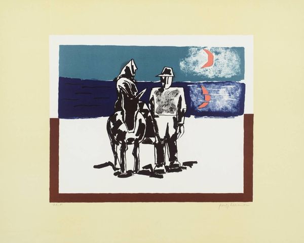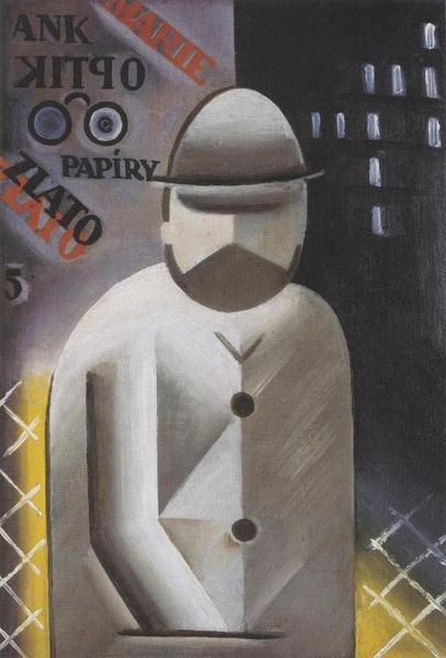 Editor: We're looking at "Man in Suprematist Landscape" by Kazimir Malevich, painted around 1930, using oil on canvas. The figure seems so out of place in the landscape. It's unsettling and intriguing all at once. What's your take on it? Curator: It is indeed unsettling. Think about the time. It was painted when Stalinist ideology was gaining ground, directly opposing avant-garde movements like Suprematism. Notice how the faceless figure looms large. Doesn't it resemble a societal critique? How the individual’s identity gets dissolved by political regimes? Editor: That makes so much sense. The lack of individual features and stark, bold colours definitely project the idea of oppression. Curator: Exactly. And note the stylized landscape. Does it evoke the traditional Russian landscape, or does it challenge its established representations, reflecting a shift in societal values and perceptions? Editor: I can see how it's both. The colours and horizon give a sense of land, but they are simplified and geometrical. It could show the transformation of Russia itself. How it held onto parts of tradition and pushed towards an unfamiliar and potentially oppressive future. Curator: Precisely. Malevich painted a society where individual expression and identity are subdued by larger socio-political forces. Knowing the context, it reflects the changing role of the artist. Editor: Thank you! I always saw it as 'abstract' but I appreciate the context and socio-political side of it. Curator: The pleasure is all mine, you helped me to think more profoundly about its place within Russian history and political culture.