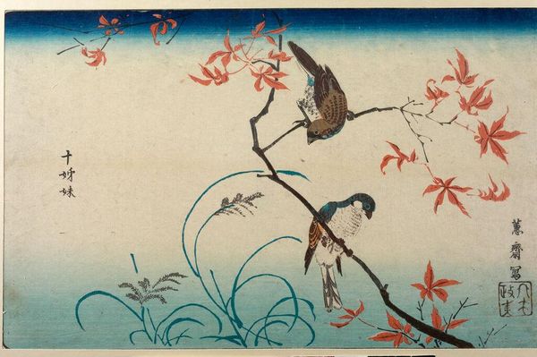 Editor: This lovely scroll painting, Java Sparrows on White and Pink Plum, is by Kano Yasunobu, who lived in the 17th century. I’m struck by its delicate beauty. What's your take on its historical significance? Curator: Yasunobu, head of the Kyoto Kano school, was painting during a period of consolidating power under the Tokugawa shogunate. Such paintings, with their refined naturalism, often served to project an image of cultivated rule and harmony with nature. Do you see how that might play out here? Editor: I see what you mean. The gentle depiction of nature reflects a sense of peace and order, maybe even idealizing society at the time? Curator: Precisely. And consider the role of such images within elite spaces – teahouses or studies – places where power was subtly reinforced through the appreciation of art and culture. Editor: That gives me a lot to think about. Thanks for the insight! Curator: My pleasure. It’s always fascinating to consider the public life of an image.