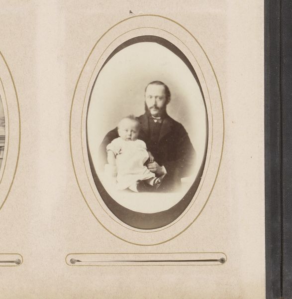 This is Heinrich Steinhauer’s diminutive photograph, "Portret van een man met snor in uniform met zwaard, aangeduid als Kellema." The visual organization here is fairly straightforward: an oval frame constrains the sitter’s formal portrait. His stern gaze, emphasized by a meticulously groomed moustache, meets ours directly, flanked by the rigid lines of his military attire and the glint of a sword. The photograph's appeal lies in its articulation of power and representation. The subject, encased in layers of uniform and framed by gilded ovals, adheres to codes of military dress, conveying authority and status. Yet, the intimacy afforded by the photograph's small scale invites closer inspection. The sitter’s identity is distilled into a set of symbols: moustache, uniform, sword. This portrait prompts us to consider how photography, even at its most formal, offers a stage for constructing identity through a semiotic system of visual signs and cultural codes.
