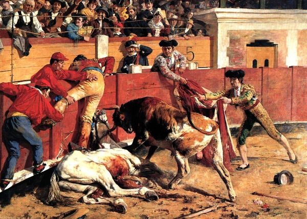 Hubertine Heijermans captures Pepin Liria in the bullring with paint on canvas, a scene steeped in cultural symbolism. At its heart, the bullfight is an ancient dance between man and beast, echoing the Minoan bull-leaping rituals of Crete. The matador, adorned in his suit of lights, confronts the bull, a symbol of raw power and virility. The red cape, or muleta, isn’t just a visual lure; it’s a flashpoint for primal emotions, channeling the atavistic struggle between control and instinct. Throughout history, the bull has appeared as a divine figure, from the Egyptian Apis to the Cretan Minotaur, embodying both sacredness and danger. Here, the drama unfolds in a cyclical ritual, evoking profound subconscious responses. The bullfight, with its blend of grace and violence, acts as a mirror, reflecting our own internal conflicts. Thus, it embodies a timeless narrative, one that persists, transforms, and continues to fascinate across cultures and generations.