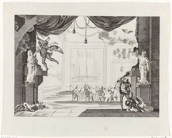 Curator: Here we have an engraving from 1787, titled "Onsterfelijke helden", which translates to "Immortal Heroes." It commemorates notable figures within a Neoclassical framework. Editor: My initial reaction is one of ordered tranquility. The balanced composition, rendered in fine lines, projects a sense of calm despite the subject’s grand scale. There's a curious serenity despite all the allegorical clamor. Curator: It certainly exemplifies the era’s emphasis on reason and order. These engravings served a very important role in spreading certain political ideas about these heroes. Take a closer look and note the careful arrangement of figures around a central column topped with angelic figures and a sphere. It resembles a classical monument, celebrating virtue and public service. Editor: I see how the monument's construction is crucial. Each element—the figures, the garlands, the portraits— contributes to the ascending rhythm. Light is clearly carefully placed to give depth. Curator: Absolutely. The portraits enshrined within the column likely depict significant leaders or intellectuals of the time, immortalized for their contributions. Editor: It’s fascinating how the allegory underscores a specific ideological program through art. A fascinating intersection. However, even in a black-and-white engraving, I can sense that texture matters. I imagine a surface rich with variations of etched lines capturing gradations of light and shadow. Curator: These engravings circulated widely, disseminating ideals of civic duty and national identity. It's propaganda elevated by artistry, shaped to influence public sentiment about revolutionary issues that are just on the horizon in Europe. Editor: Yes, a perfect confluence of form and political agenda! Understanding the historical impetus enhances one's understanding. Curator: Studying works like this help reveal not only artistic intent, but how power manipulates visuals. Editor: Well, this dive illustrates just how effectively symbolism and careful composition come together! Curator: Indeed, it gives plenty to ponder on society, the individual and politics.