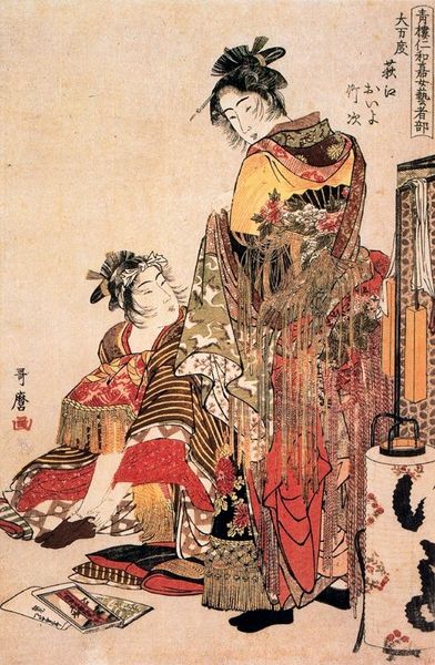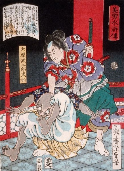 Curator: This print immediately unsettles me, the vibrant colours clashing so violently with the horrific scene depicted. Editor: It’s definitely a striking image. What we’re looking at is a woodblock print by Tsukioka Yoshitoshi titled "Shiranui Kneeling Beside a Crucified Man," created in 1867. Curator: Crucified man? This takes the crucifixion as pure symbol outside any single tradition. Who is Shiranui, and what does this configuration represent to Japanese society? Editor: Shiranui was a character from the popular Suikoden stories – tales of heroic outlaws, very loosely based on the Chinese novel, "Water Margin." The image certainly appropriates the crucifixion image to highlight both the dramatic exoticism of contact with Europeans, and also to cast these Japanese rebels as Christ-like figures facing brutal suppression from the governing elites of Japan. Curator: The emotional tenor is incredibly complex. There’s a serene detachment in Shiranui’s pose. What are the politics of viewing pain in this way, and where are the politics of sympathy? Editor: Ukiyo-e prints often played with heightened emotion, drawing on theatre and storytelling traditions. The detached aesthetic you observe, alongside the vivid use of color to depict blood and torment, seems almost calculated. But by using the figure of the woman kneeling we receive information about the impact and importance of this event through her sorrow. The figure might embody the cultural tension felt between Japanese tradition and Western influences during that period. Curator: And she herself is literally textualised! There is that strange hovering white space – the lantern sign! I am very interested in where cultural traditions and cultural change create visual rupture. It's as though a playbill announces that he is a criminal about to receive public treatment and she is merely, though beautifully, observing! Editor: The Suikoden narratives themselves were often censored for their rebellious themes. To cloak it with a tragic European narrative must have offered a symbolic distancing device that let Yoshitoshi play freely on anti-establishment sympathies within his audience. Curator: That layering of cultures adds a whole dimension of resistance to the image. Thanks for bringing that into focus. Editor: A pleasure. I find these cultural collisions make for the richest ground to understand a culture’s aspirations and fears.