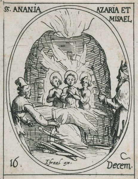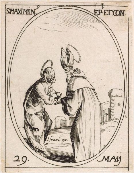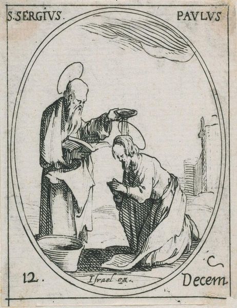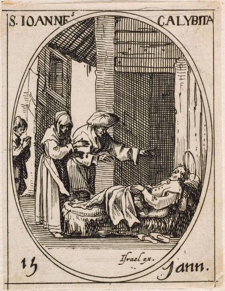 Editor: This small engraving by Jacques Callot, titled Saints Basilissa and Anastasia, depicts what appears to be the saints caring for the sick. The figures seem huddled together, almost secretive. What do you see in this piece? Curator: I see a narrative deeply rooted in the socio-political context of the time. Consider the role of women, particularly in religious orders, and their acts of charity. How does Callot's depiction reinforce or subvert prevailing notions of female piety and agency? Editor: It's interesting how you frame it in terms of agency. I hadn't considered that angle. Curator: Well, who are these women? What historical forces shaped their lives, and how might Callot be commenting on those forces through his artistic choices? It goes beyond a simple depiction of piety, doesn't it? Editor: Definitely gives me something to think about!