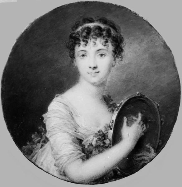 Curator: Cornelius Høyer created this delicate piece, "Young Lady with Flowers," sometime between 1756 and 1804. It’s currently held here at the SMK, Statens Museum for Kunst. He worked with tempera on ivory, producing a miniature portrait in black and white format. Editor: Isn't it ethereal? She looks like a whisper of a dream. There's something so intimate about its scale and monochrome palette that just pulls you right in. Curator: Absolutely. The choice of ivory as a ground speaks volumes about luxury and accessibility at the time. It was a costly material, indicative of the sitter’s status and Høyer’s clientele. Tempera, too, allowed for incredible detail, vital for miniatures. Editor: Imagine the patience involved! I can almost feel the delicate brushstrokes and almost the sitter's soft breath as she posed for the artist. It really transports you back into the intimacy of 18th century salon culture. I wonder what sort of stories this girl held. Curator: Her gaze and demeanor is quite intriguing indeed. While adhering to Rococo portraiture conventions with its elegance, intimacy, and emphasis on beauty, it does perhaps question how labor, artistic labor in particular, and the availability of luxury materials intersects. This artwork provides insights into production costs, markets for paintings, and societal emphasis on refinement of aesthetics and culture in that period. Editor: Hmm. You make a convincing point about value! I still believe the picture seems like she is a mystery herself, lost in thoughts within that elaborate Rococo setting. It seems almost meditative to me. It invites you to share those silent, contemplative thoughts, I believe. Curator: Yes, indeed. Høyer manages to encapsulate the spirit of the age, where elegance was paramount but, simultaneously, he gives viewers the impression of someone very authentic too. This combination renders the work so powerful even nowadays. Editor: And after all this time, standing here with this image, feeling the echoes of Rococo play in my mind, I keep imagining stories about her that are long gone. It brings history alive somehow, doesn’t it?