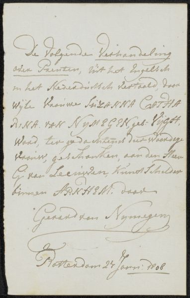 This is “Brief aan anoniem,” or “Letter to Anonymous,” written by Gerrit Lamberts on November 10th, 1843. The letter gives us a brief glimpse into the social and intellectual life during the 19th century in the Netherlands. The personal note is addressed to an anonymous "Welldele Heer," or "Respected Sir," and refers to catalogs. Its formal tone and careful handwriting speak to the importance of written communication during this time and the social expectations surrounding it. The act of writing and sending a letter was a deliberate act, which underscores the value placed on personal connections. While the contents of the letter remain somewhat obscure due to its brevity, it nonetheless hints at a world of intellectual exchange, cataloging, and scholarly networks. The act of addressing it to an anonymous person adds an element of mystery, prompting questions about the nature of relationships and communications. What could it mean for a letter to be written to someone unknown? What can it tell us about the author's mindset?