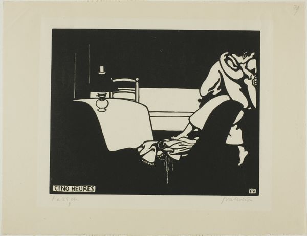 Félix Vallotton created this woodcut, "Extreme Measure," using a single block of wood, meticulously carved to produce stark contrasts of black and white. Vallotton's embrace of woodcut, a craft medium, allowed him to challenge the prevailing hierarchies of the art world. The printmaking process, inherently reproducible, democratizes art, making it accessible beyond elite circles. The sharp, graphic quality of the woodcut emphasizes the emotional intensity of the scene, amplifying the tension between the figures. The labor-intensive process of carving each block contrasts sharply with the mass-produced imagery of the era. Vallotton reclaims control over the means of production, infusing the image with a handmade quality that resists the anonymity of industrialization. By choosing craft, Vallotton imbues "Extreme Measure" with layers of social commentary and artistic rebellion, blurring the lines between fine art and craft.