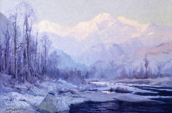Sydney Laurence made this painting of Mount McKinley, likely in oil paint, during his lifetime. The blues and purples feel cool, calming. It’s like he’s not just painting a mountain, but capturing the whole mood of the place. You know? Looking at the way he layered the paint, especially in the mountains, it’s thin, almost transparent. It creates a hazy, dreamlike effect. In the foreground, the brushstrokes feel a bit more choppy, like he's trying to capture the movement of the water. There's this one spot in the lower part of the painting, where the water hits some rocks. The way he layered the whites and yellows there feels energetic. It reminds me of Albert Bierstadt. Both artists paint these grand landscapes, but while Bierstadt goes for the dramatic, Laurence is more about the subtle, quiet beauty. For Laurence, painting feels like a way of meditating on the landscape. Art doesn’t always have to shout; sometimes, the quietest voices speak the loudest.