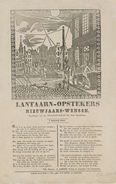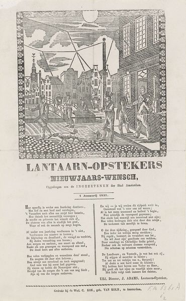 This printed broadside, made in Amsterdam in 1872, conveys New Year’s greetings from the city’s gas lamplighters. The image reminds us of the social and technological changes transforming European cities at this time. The visual language creates meaning through its contrasting images. The upper register shows classically styled public buildings, suggesting civic pride and progress. But below, the lamplighters are pictured at work, pushing carts and operating the machinery of gas production against a backdrop of factories. This juxtaposition hints at the social divisions and labor conditions that fueled Amsterdam's modernization. The poem printed on the sheet reflects on the past year with a mix of hope and anxiety about the future, perhaps alluding to the social tensions of a rapidly changing society. To understand this image better, one might research the history of public utilities in Amsterdam, the social conditions of its working class, and the changing visual culture of the late 19th century. Such resources help us interpret art as a product of its specific social and institutional context.
