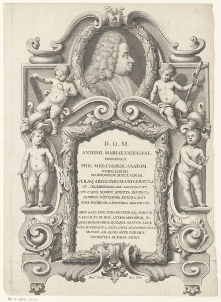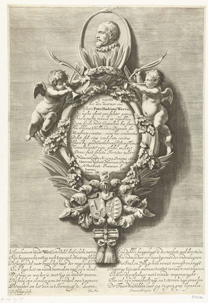 Curator: Pieter Nolpe’s 1650 engraving, “Allegory in Honor of Christina of Sweden,” is… well, it's a lot, isn’t it? Editor: It definitely is. There’s so much happening. It feels almost overwhelming. What strikes me most is the central text – I mean, it is so prominent – like we're supposed to be reading a historical document rather than looking at an artwork. What should we make of all this detail? Curator: I find the density exciting. It is, after all, an *allegory*. We aren’t just seeing Christina; we're seeing her through a lens of symbolic representation. And yes, the text! That's really the heart of it. Nolpe uses language to amplify the visual elements, like a key unlocking the meaning of each figure. It is a declaration, a public statement of Christina’s virtues and reign. What does it whisper to you, looking closer at the composition itself? Editor: The two figures holding globes are striking. On one side, we have “Felicitas Temp”, on the other side, “Securitas”. That positioning gives them an enormous weight to carry. Are these burdens or statements? Curator: Exactly. Are they burdened, or are they powerful, solidifying Christina’s reign with earthly stability? Look how Nolpe positions the figures, placing each carefully to convey her sovereignty, the hopes projected on her. Imagine what it must have been like to experience this image when it was first printed and distributed. Now, does it shift your perspective on the 'document' aspect? Editor: Absolutely. Knowing more about the symbolism and the cultural context, I see this print less as an overwhelming historical artifact and more as a carefully constructed, dare I say, piece of propaganda. It makes me appreciate the level of thought Nolpe put into this! Curator: Indeed. And isn't it wonderful how even something created to project power can, centuries later, offer a more subtle and reflective insight? A reminder that the voices of the past are ever-shifting, constantly reinterpreting with each encounter.