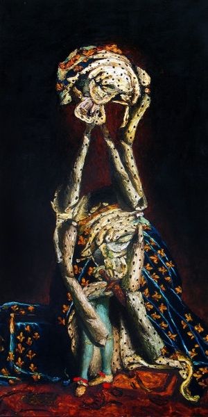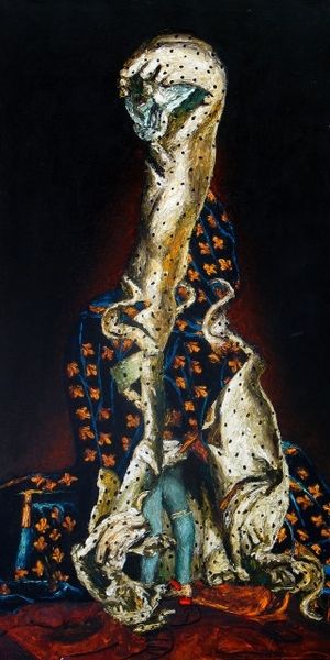 Curator: Let's turn our attention to Alexander Roitburd's "Harmony of the Illuminated Being," completed in 1989, and executed using oil paint, quite heavily applied I might add. What are your initial thoughts? Editor: Goodness, it’s… unsettling, in a fascinating way. That towering figure, almost straw-like, with those grotesque smiles... It’s the stuff of fever dreams, isn't it? Makes me think of some forgotten carnival effigy. Curator: It's interesting you say "straw-like". I see the impasto technique contributing a rawness to the surface, a certain earthiness achieved through the sheer physicality of the paint. The act of applying the pigment, the labor invested, becomes quite palpable. Editor: Absolutely, you can practically feel the artist's hand wrestling with the paint. And yet, beneath that apparent roughness, there’s something…intentional. Those piercing stares – are they joyous? Manic? The expression is ambiguous. Is this some sort of commentary on post-Soviet euphoria, perhaps? Curator: I find it hard to overlook that this painting exists as both a portrait and an abstraction simultaneously. Considering Roitburd’s social circles, I can’t help but analyze how it juxtaposes the aesthetic conventions of traditional portraiture with expressionist abstraction as a way to maybe discuss individuality. Editor: You know, those 'smiles' remind me of political caricatures; overblown, toothy grins plastered on figures of authority. The more I look, the more it feels like a veiled jab at…well, someone powerful. The muted background, almost a stormy sea, only heightens the sense of unease, the looming threat. Curator: The social context of late 80’s Ukraine undeniably shaped Roitburd's artistic output. This piece exists amid a very exciting era where Ukrainian artists challenged socialist realism while still trying to process their own unique history, politics and cultural identity. Editor: I'm thinking there’s a deep-seated anxiety lurking beneath the surface – an anxiety maybe about autonomy, control, identity. It’s certainly not a harmonious image for me. The figure may be ‘illuminated’ but it’s shedding light on something…ugly. Curator: I'm so glad we lingered with this artwork. Seeing Roitburd's paintings and understanding more of their processes help contextualize an artist grappling with the tumultuous changes around them. Editor: Definitely. It's one of those pieces that burrows into your brain and stays there. Even when you’re done, those…smiles keep flashing back!