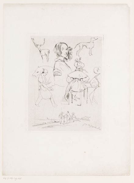 Johan Michaël Schmidt Crans created this print in 1861, a commentary on the lottery for flood relief. The central, tilted frame displays chaotic sketches of animals—horses, dogs, perhaps a deer—evoking the unpredictable nature of fate and the hunt. These animals, caught in mid-motion, remind us of similar motifs found in Paleolithic cave paintings and ancient tapestries. They resurface throughout history, each time mirroring a culture's anxieties about chance and survival. Think of the Roman mosaics depicting hunts or the medieval tapestries with mythical beasts. The tilted frame itself is a symbol. It reminds me of the wheel of fortune, or perhaps even a distorting mirror reflecting society's hopes and disappointments. It is this cyclical progression—the eternal return of symbols—that captivates us. Each era leaves its mark, layering new meanings onto these ancient forms.