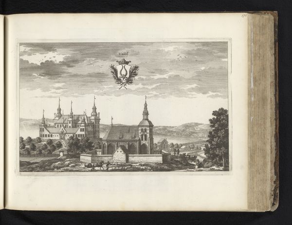 Jean Marot created this print, “Gezicht op slot Vibyholm,” likely in the mid-17th century. The engraving presents a symmetrical composition, dominated by the architectural mass of Vibyholm castle. The intricate details of the facade and the balanced arrangement of the surrounding landscape elements are striking. Notice how Marot uses precise lines to define the structure, emphasizing its three-dimensional form through contrasting light and shadow. This geometric clarity serves not only to depict the castle accurately, but also to project an image of order and control. The castle isn't just a building; it's a statement of power. Consider the semiotic implications of this formal presentation. The detailed rendering and balanced composition invite us to see the castle as a symbol of stability and authority. This attention to form over emotion challenges fixed meanings about architectural representation, offering a space for ongoing interpretation and re-interpretation.