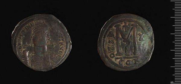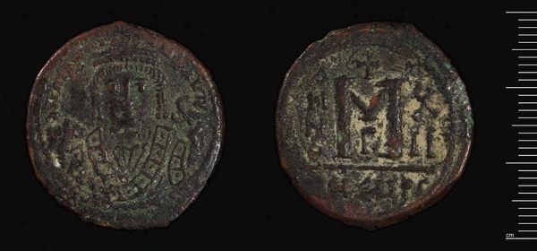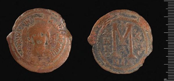Curator: Here we have a Follis of Justinian I, crafted in Constantinople. Its current weight is approximately 20.36 grams. Editor: It's incredible how much history can be held within such a small object. The patinated surface speaks volumes. Curator: Indeed. Notice the iconographic program: the Emperor’s portrait on one side and the prominent 'M' value mark on the other, framed by carefully inscribed text. Editor: But the material itself—copper—suggests a wider narrative. Think of the mines, the labor, the trade routes required to put this coin in someone's hand. It's a whole economic system encapsulated. Curator: Precisely. And the condition, of course, invites us to consider its circulation, its use, and how its meaning may have evolved over centuries. Editor: A tangible connection to a very distant past, wrought from the earth. Curator: It allows us to perceive value in ways extending beyond mere currency. Editor: Making even a coin into a profound object, if we let it.