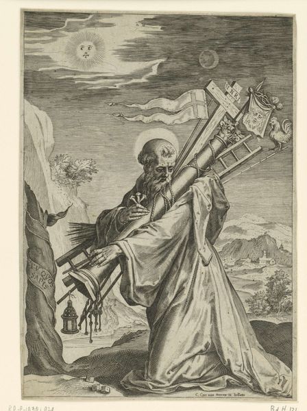 Pieter de Jode the Elder created this engraving of Saint Christopher sometime between the late 16th and early 17th centuries. Christopher, the patron saint of travelers, is shown here carrying the Christ Child across a body of water. This image speaks to the period's intense religious feeling and the role of the Church in everyday life. Made in the Southern Netherlands, we can see the visual codes of the Catholic Reformation at play. Consider the visual representation of the saint himself: the artist links the humble ferryman and the divine savior. This is a theme that would have resonated with a society structured by rigid hierarchies of class and religious authority. The historical context here is crucial; the print comes at a time when the Catholic Church sought to reaffirm its power. Understanding this print involves delving into the religious, political, and institutional history of the period. Research into the Counter-Reformation, the lives of saints, and the patronage of religious art would shed further light on its meaning.