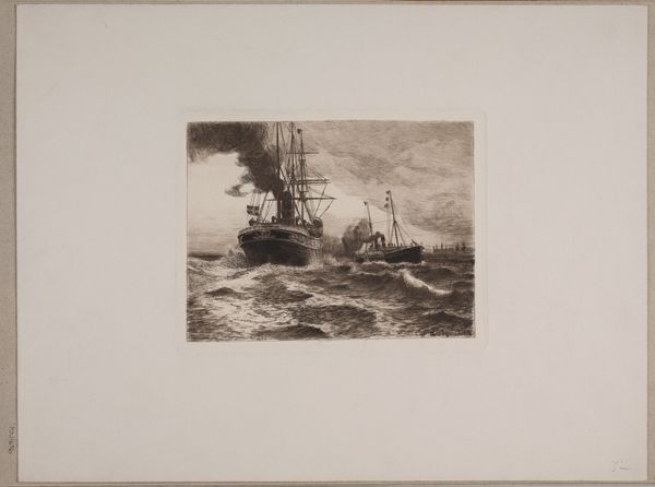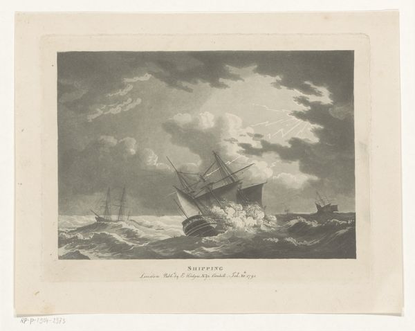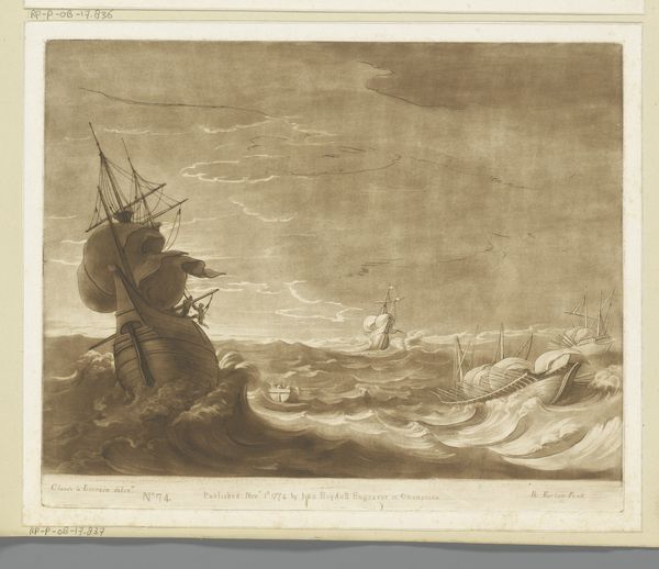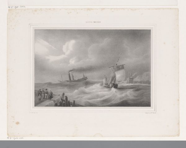 Adolf Carel Nunnink made this lithograph, "Zeilboten op wilde zee", likely in the mid-19th century. Lithography is a printmaking process based on the principle that oil and water don't mix. The artist would draw an image with a greasy crayon onto a flat stone, treat the stone with chemicals, and then use oil-based ink to print the image. The appeal of lithography was in its capacity to reproduce a wide range of tones, and the textural effects of crayon drawing. Here, those qualities lend themselves perfectly to depicting a stormy sea. Consider how the gradations in tone capture the dynamism of water, the looming sky, and the texture of billowing sails. What’s also interesting is the social context. Lithography democratized image production, making art more accessible. This print exemplifies how industrial processes could capture even the most dramatic and romantic subjects. The combination of artistic skill and mechanical reproduction speaks to a changing world, where both nature and art were being reshaped by new technologies.