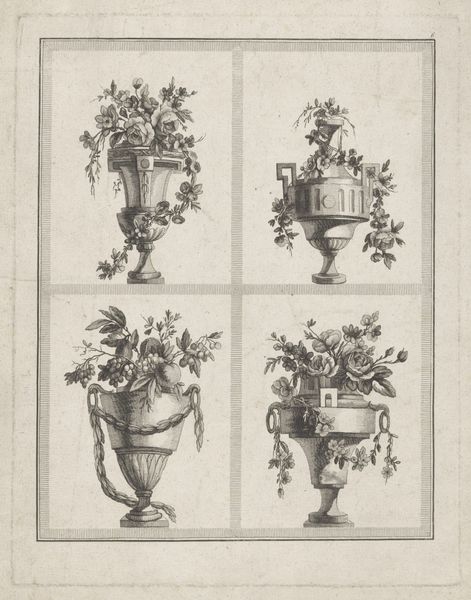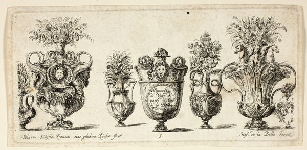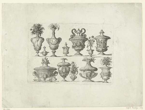 Mauro Antonio Tesi created ‘Zeven vazen’, or ‘Seven Vases,’ as an etching around the mid-18th century. The linear precision renders each vase with a distinct identity, despite their symmetrical arrangements. The vases, rendered in monochromatic lines, sit against the muted background. This print displays Tesi’s interest in the interplay between classical forms and decorative exuberance characteristic of the late Baroque period. The vases, while rooted in classical silhouettes, burst with ornamental details such as serpentine handles, grotesque masks, and sculptural figures. Tesi engages in a visual dialogue, questioning the boundaries between functionality and pure aesthetic pleasure. The composition, with seven distinct vases in a row, creates a sense of both rhythm and variation. The linear quality enhances the contrast and gives each vase its distinct persona. Note the subtle shifts in weight and texture. These are signs of the artist's hand in the etching process. Consider how Tesi transforms utilitarian objects into a stage for the play of form and surface. The arrangement questions whether the function of these forms is practical, or purely aesthetic.