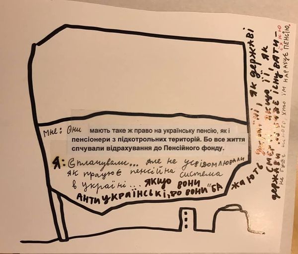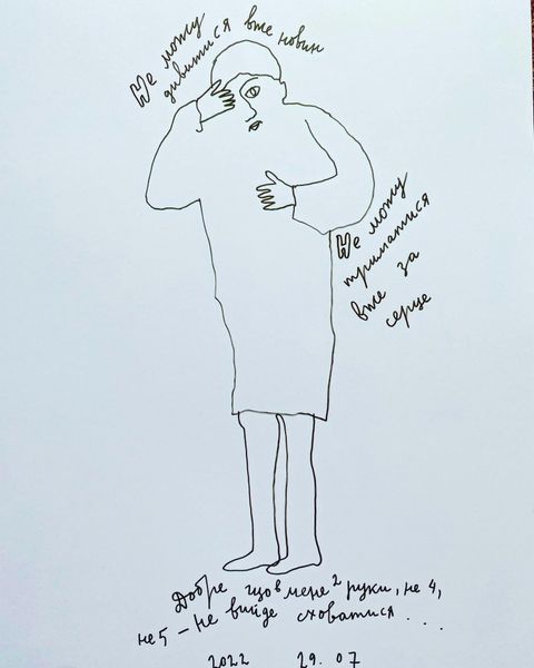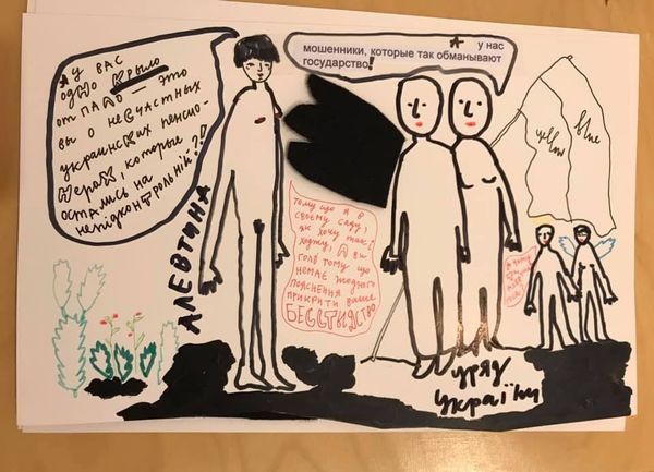 Curator: Alevtyna Kakhidze’s “Untitled. Strawberry Andreevna” created in 2019, offers us a peek into her personal sketchbook, combining ink drawing and collage on paper. What jumps out at you initially? Editor: Well, the stark black collage element immediately grabs my attention. It’s this imposing, almost aggressive shape cutting across a much gentler scene drawn in ink. The overall effect creates a sense of unease. Is that intentional? Curator: Absolutely! Kakhidze often uses a playful, almost naive style to tackle quite serious subjects. She invites us into what feels like a very personal world. To me, it feels like a raw outpouring of thoughts on paper, like overhearing someone's stream of consciousness. Editor: The snippets of text interspersed throughout, are they in Ukrainian? It reminds me a little of art that reflects experiences related to conflict and displacement, perhaps reflecting a kind of commentary on the state's effect on individuals. The mention of pensions… Curator: Yes, the text definitely gives us clues. From what I understand, some of it touches on the artist's own experiences navigating bureaucracy. It is simultaneously funny, sad, and angry, which I find to be very moving. It makes me reflect on the precarity of everyday existence. Editor: I find that interesting, because even without understanding the specifics of the text, the visual language itself communicates that feeling quite powerfully. The clashing aesthetics – that brutal black shape versus the delicate lines, hints at a system or experience that’s inherently disruptive and oppressive. It evokes political struggles. Curator: Exactly! The combination is powerful, almost like a visual scream, echoing the struggles. Editor: It’s the way the drawing blends this sense of intimacy with a more public discourse that I appreciate the most. Thanks to Kakhidze’s piece I have been provoked to consider individual experiences within a wider system of injustice. Curator: Yes, Alevtyna offers a lens through which we might view the world, its difficulties, and all of its hopes through a sensitive and yet critical point of view.