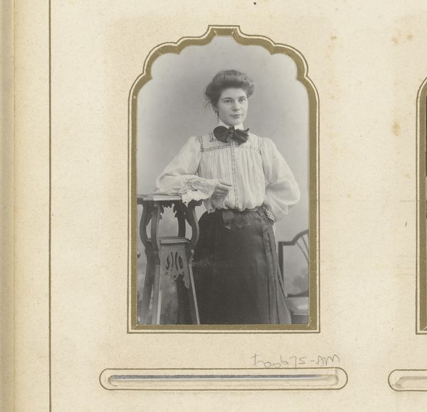This photographic portrait, by O. Tippmann, features a young woman with an umbrella, captured in a frame measuring just 85 by 51 millimeters. The sepia tones lend an antique feel, emphasizing the subject's dress and the soft gradations of light across the backdrop. Consider the composition: the subject is centrally placed, holding a dark umbrella that contrasts with her light blouse. Her positioning is more than just aesthetic; the umbrella acts as a structural element, dividing the pictorial space and directing the viewer's gaze. The framing itself, with its arched top, recalls architectural motifs, adding another layer to the composition. The photograph operates within a semiotic system; the umbrella, clothing, and even the woman's hairstyle all carry cultural codes about gender, class, and identity. It invites us to decode these elements, questioning how such visual signifiers function within the society of its time. Notice how the framing creates a sense of enclosure, yet the gaze of the young woman directs outward. This interplay between containment and outreach is a fascinating formal quality that challenges us to consider the evolving roles and representations of women.