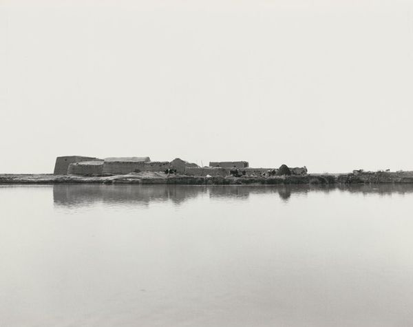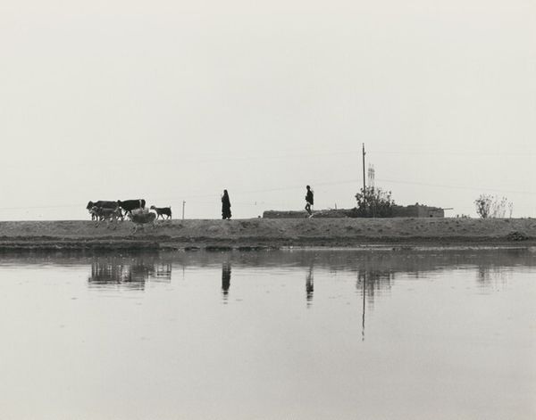 Editor: This is an untitled photograph by Ursula Schulz-Dornburg, taken in 1980. The silvery tones and the flat, watery foreground give it a strangely peaceful yet desolate quality. What strikes you about this work? Curator: I see a landscape almost stripped bare, a stage for primal existence. The animals along the ridge are starkly rendered, archetypal forms against a pale backdrop. They become potent symbols— survival, perhaps, and the enduring link between humanity, animals and place. Editor: It feels very minimal, almost abstract, despite clearly depicting a real place. Is there a reason to depict places stripped of civilization? Curator: The apparent simplicity is deceptive. Note the reflections in the water, how they double and distort the 'real' world above. Schulz-Dornburg presents not just a location, but a meditation on perception and reality. Do the stark, repeated lines remind you of something? Perhaps boundaries? Editor: Boundaries, yes! Like edges of settlement. It makes me wonder where it was taken and what the circumstances of the inhabitants may be. Curator: Precisely! The artist frequently photographed regions on the margins – both geographically and politically. She recorded those whose existence is etched in the land, preserving a visual memory of those people and places which may easily be forgotten or overlooked. Editor: So it’s about reminding us of shared cultural memory. Thank you – that really deepens my understanding of what I am looking at. Curator: My pleasure. Looking closely at the arrangement of these visual symbols enables us to remember something profound about what endures across place and time.