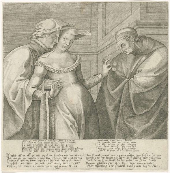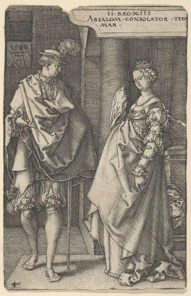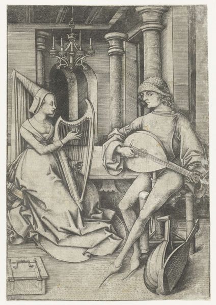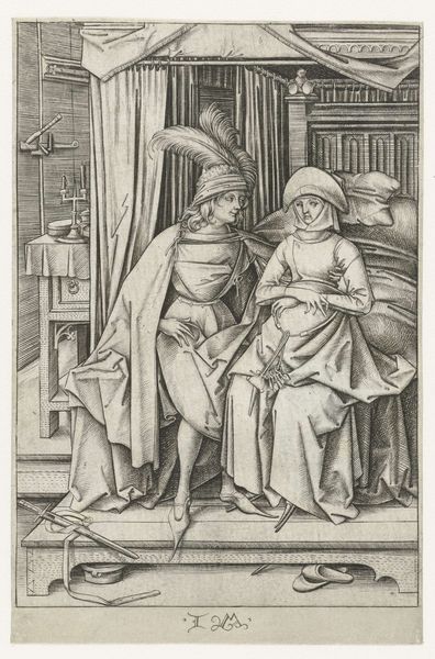 Curator: I find it really striking how the textures pop in this print. There's a calmness that hits me when I first look at it, almost meditative. Editor: Absolutely, that meditative quality likely stems from the carefully constructed social roles and power dynamics presented in "The Visit to the Spinner," an engraving by Israhel van Meckenem, dating roughly between 1495 and 1503. Curator: Oh, a visitor, is it? With the feathery hat? I wonder who is in charge! Editor: Good question! While ostensibly a genre scene, depicting everyday life, it's worth noting that the male figure, adorned in rather elaborate attire and accompanied by a sword, signifies a higher social status compared to the woman at her spinning wheel. These visual cues encourage us to interpret the visit as something more than just a casual encounter, subtly underlining existing social hierarchies. Curator: Yeah, the whole composition directs my eyes right at him and the cat almost feels staged at his feet! It’s as if this moment in the domestic sphere has a weight beyond the threads being spun. The way he’s posed—like he expects to be admired…! Editor: Precisely. And observe the contrast between the domestic setting and the male figure’s display of wealth and status. This interplay points toward broader issues of gender, class, and the ways in which societal roles were both performed and reinforced during the Northern Renaissance. Moreover, consider how the medium of engraving, with its emphasis on linear precision, lends itself to a detailed articulation of these social nuances. Curator: Mmm, interesting… I thought I saw some jugs, too. Maybe some ritual is occurring, like when the jugs are prepared and someone is coming? And is that a loom standing up right, to her right? Also I am quite impressed with the fact that one is viewing what the inside life might be… Maybe with him barging in? Also note his boots that may or may not be high-heeled! Editor: From a symbolic perspective, his footwear, her spindle—they articulate and circumscribe social differences. They also show how he might not need the help as she struggles in a more marginalized world? The artist shows both of them doing such an occupation, she physically creating cloth, while he observes and probably is not the most creative himself, rather perhaps a patron of sorts... It reveals so much about labor and wealth! Curator: Absolutely, he definitely looks like the creative's sugar daddy. That little kitty knows exactly where the power dynamic sits. All things in perspective. I had one hell of a view to gain today with your interpretation. Editor: As did I, noting your artistic perspective to complement this discussion! I shall always see an income disparity between labor, art, and cats going forth, now.