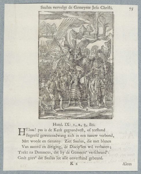 Christoffel van Sichem II created this print, "Jacob met zijn familie op weg naar Egypte," at an unknown date using woodcut techniques. The high-contrast black lines on the light paper immediately draw the eye, creating a stark and dramatic effect. The composition uses a dense network of lines to depict figures and landscapes, evoking a sense of movement and purpose. Sichem’s use of line is particularly striking. Note how the parallel hatchings create shadows and textures. The visual elements invite us to consider the structural relationships between the figures, animals, and landscape and the symbolic meanings of journeys. The print also uses a semiotic system, employing visual codes that would have been readily understood by its contemporary audience. The image isn't just an illustration; it's an interpretation of religious narrative, reflecting contemporary values and beliefs. This complex interplay of form and content is how the artwork communicates ideas. Through its formal structure, the artwork engages with broader cultural narratives, inviting ongoing interpretation and reflection.