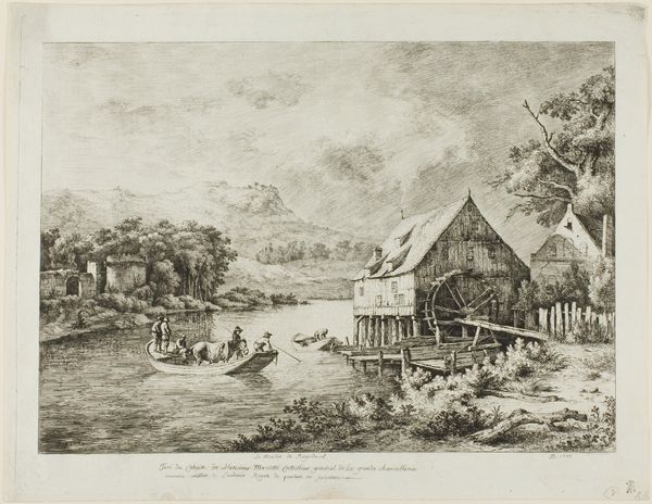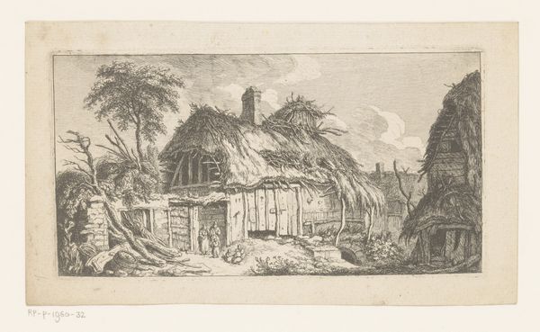Franz Edmund Weirotter created this etching of women and children at a farm. Notice how Weirotter uses line and form to build a rustic scene. The thatched roofs and timbered structures use dense, chaotic lines which contrast against the softer, smokey sky. This contrast creates a tension between the human-made and the natural environment. The lines of the buildings, though detailed, lack refinement, suggesting a world where the practical outweighs the aesthetic. The etching technique itself, with its reliance on linear structures, mirrors the structuralist idea that underlying patterns govern our perceptions. Consider how the layout of the farm and the figures directs the viewer's eye. The figures are placed centrally, drawing us into the domesticity of the scene, while the architectural lines create a sense of enclosure. The artwork invites us to consider how formal elements intersect with cultural and philosophical perspectives. The etching's lasting appeal resides not only in its aesthetic qualities but also in its role as a signifier of cultural values.
