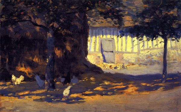 Curator: Looking at Rose O’Neill’s “San Gabriel Road,” the first thing that strikes me is the raw materiality. Notice how the impasto technique, the thick application of oil paint, makes the surface so tangible. It almost feels like you could reach out and touch the stucco walls or the rough bark of those trees. What do you make of that? Editor: I think it really captures a specific moment in time. You can almost feel the heat radiating off the road. There's something almost tactile about the light, as if the brushstrokes themselves are catching it. What is your interpretation of her technique? Curator: For me, the use of oil paint becomes a key element in understanding O’Neill's work beyond just visual representation. The act of applying that much paint, the physical labor involved in building up those textures, it points towards a very deliberate process. Consider how the Impressionists were changing the role of the artist. They began stepping outside of the atelier and into nature to capture these views en plein air. Instead of idealized visions they were creating objects from observation of their surroundings in real-time and then offering these back to their new audience. What aspects do you find to be the most captivating to you? Editor: That’s a really interesting point. I guess I hadn’t considered the actual labour involved. The rough textures of the oil paint do seem at odds with the idea of a serene landscape. It shows you that she didn't try to overly romanticise a scene by taking place within a community space. Curator: Precisely. So how might this piece inform our understanding about the role of impressionism, not only with subject or form, but even about economics and labour? Editor: This piece offers us a glimpse into her community, as well as her process to offer this point of view, with the labour that took place in this very setting. Curator: Exactly, a material testament to a specific place, time, and labor.