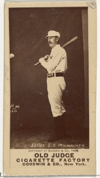 Editor: This is a baseball card from 1887, titled "Johnston, Center Field, Boston," part of the Old Judge series. It looks like a photographic print. The athlete seems frozen in time, with a seriousness that feels almost… melancholy. What stands out to you about it? Curator: Melancholy… Yes, a world before gloves and billion-dollar contracts! What captivates me is how something as fleeting as a moment on the baseball field gets embalmed onto a cigarette card. Think about that. This isn’t just about baseball; it’s about the ephemeral nature of fame, desire and even our own mortality! The "Old Judge Cigarettes" banner looming overhead almost like fate. Almost ironic, given what we now know about the relationship between baseball players and chewing tobacco and cigarettes! Don't you think? Editor: I do! I guess I hadn't considered the cigarette ad element to the overall feel. The composition is also striking - that ball hovering mid-air. The player, about to make impact. What I found peculiar about this print, which may not have been obvious, is the amount of photoshopping applied to a baseball photograph. How rare is that? Curator: Extremely! We’re looking at something meticulously staged, idealized. Look closely and note how the baseball floats! The photographer, Goodwin, is creating a myth here. He is less interested in a literal record. He is more into cultivating a sense of admiration, creating legends, and selling more cigarettes. You have to wonder: Were these guys actually playing baseball? Editor: So, less a snapshot and more… advertising art? Curator: Precisely. Each tiny, tobacco-stained photograph in its way speaks of this almost impossible desire, which we also participate in today. To capture, possess and own this kind of heroic glory, even if just for a single smoke. Editor: That really changes how I see it. What started out feeling melancholy now feels much more like a calculated effort to immortalize - and commodify. Curator: Exactly. These objects teach you that the meaning lies not only in what is being shown, but also in how and *why* it's being shown!