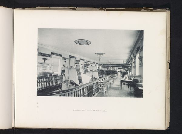 Curator: Here we have an intriguing photomontage from sometime between 1931 and 1937, titled "Uitstalling van machines", which translates to "Display of Machines." It's housed here at the Rijksmuseum. Editor: Immediately, I am struck by how stark and almost unsettling it is. The contrast is quite strong. The machines on display under a banner...it speaks of a utilitarian age, doesn't it? Curator: Yes, the materiality speaks volumes. It is a photographic print but assembled. The method is intriguing: to capture an industrial moment in high Art Deco fashion is interesting in that era. The machinery, likely quite modern for its time, suggests evolving social production. What do you make of that motto at the top, "Ex undis sol"? Editor: Ah, “From the waves, the sun.” Given the prominence of machines, I can’t help but interpret the Latin inscription as symbolic of technological innovation rising, phoenix-like, from the raw potential of nature. Almost a heralding of the age to come, which feels potent in the context of pre-war anxieties. The banner looks very regal almost religious like a promise. Curator: I find it a little unnerving too, this imposed narrative upon simple tools displayed almost for religious acceptance in Art Deco geometry. And note the sharp contrast between light and dark emphasizes industrial processes and output - very dramatic for that time but speaking so coldly, too. It is both impressive and off-putting for the artist to so starkly showcase these new machines! Editor: Indeed. It's as though they're trying to give mundane manufacturing this aura of monumental destiny. Are they trying to mask labour with design in some manner? Curator: A definite possibility. By imbuing it with such symbolism, it somewhat softens the harsher aspects. Let's not forget Art Deco celebrated speed, progress, all embodied so elegantly in the machine aesthetic; but this image challenges it, exposing it! It challenges both material and symbolism. Editor: A powerful observation. Thinking about its symbolism in our time is rather unsettling in context. Curator: Agreed. Editor: This has shifted my thinking entirely. A curious piece, and all the more fascinating to reflect on.