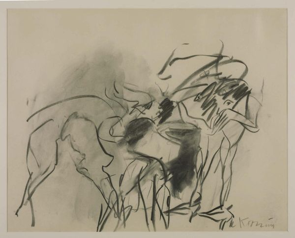 Editor: This is Robert Motherwell’s "Pregnant Nude Holding a Child," a 1953 ink drawing. The starkness of the black ink against the fleshy orange tones is really striking, but I find the composition so fragmented and unresolved. What do you make of it? Curator: Well, seeing it as a product of its time helps. Abstract Expressionism, in the post-war period, grappled with representing trauma and existential anxieties. How might societal expectations about women’s roles at that time, coupled with these anxieties, play out in Motherwell’s representation of motherhood? Editor: Hmm, I suppose the fragmented figures could reflect a feeling of societal pressure or a loss of control? Is the abstract style almost a commentary on how women are perceived rather than how they exist? Curator: Exactly. Consider the institutional history too: galleries and museums in the 50s were largely dominated by male artists. How does that power dynamic influence what gets shown and how these subjects are treated? Think about the ‘male gaze.’ Editor: That’s a really important point. Did Motherwell’s work also reflect the political atmosphere of the time in other ways, consciously or unconsciously? Curator: Absolutely. Think about the Cold War anxiety and the threat of nuclear annihilation. Abstract Expressionism can be viewed as a reaction against representational art forms promoted by totalitarian regimes. Do you think there's an inherent political statement in choosing abstraction at that moment? Editor: Yes, I see that now. Looking at it in this new context, it seems so much more than just lines and colors. It’s a historical and political statement. Thanks for expanding my perspective! Curator: My pleasure! Art always reflects broader social currents, whether the artist intends it or not. That intersection is where the real insights emerge.