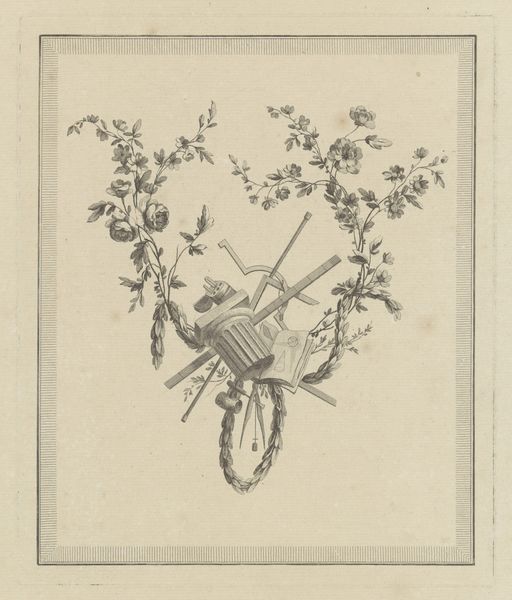 Editor: This is "Schilderkunst," a print from around 1760-1784 by an anonymous artist, housed in the Rijksmuseum. It has this delicate, almost lacy quality to it because of all the floral details. What do you see in this piece? Curator: The very production of this image—an engraving, a print—interests me greatly. Think about its reproducibility. It democratizes art. These weren't singular, precious paintings owned by the elite. These were made to be circulated. And look closely: it depicts the *tools* of painting alongside decorative floral elements. This challenges a hierarchy. It puts the labour of artistic production—the very *making*—on the same level as, even intertwined with, beauty. Editor: That’s interesting! I hadn't considered the implication of using a print medium for this sort of allegorical work. How does this contrast with traditional paintings of the time? Curator: Traditional paintings often veiled the process. This print exposes the means. Think about the engraver’s hand, the printing press. The availability of printmaking itself enabled a different social engagement with art, impacting consumption. Before mass media, how revolutionary was this to challenge this? The artist's identity, 'Anonymous', further reinforces the theme, doesn’t it? Editor: Absolutely, and that’s made me reconsider the floral garland. Is it perhaps referencing labour and materiality beyond just the art-making implements represented? Curator: Precisely! Where do these materials come from? Whose labor cultivates the natural resources transformed into art and ornamentation? Editor: It really changes how you look at this piece, realizing the deeper context around artistic creation at the time. Thanks! Curator: Indeed! Analyzing art through the lens of material and production opens new and exciting perspectives.