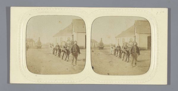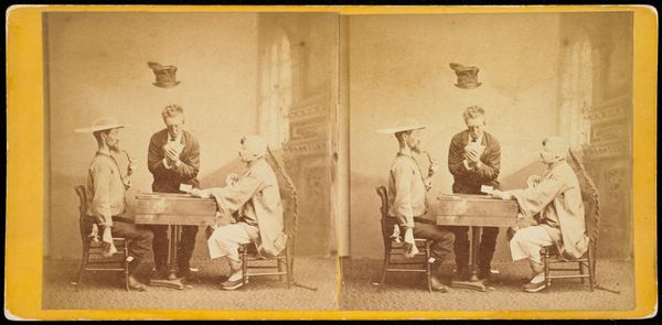 Alexis Gaudin made this stereo card, entitled Camp de Châlons, in 1857. A stereoscopic card like this would have been placed in a special viewer that would trick the brain into seeing a three-dimensional image. Here we see a group of men, presumably soldiers, sitting around a table, sharing a meal, and drinking wine. Stereoscopic cards were a popular form of entertainment at the time, but they also served as a form of documentation, and this card offers a fascinating glimpse into the daily life of soldiers in the French army during the Second Empire, when France was at war with Russia in the Crimea. The image presents the army as an institution, with a hierarchy shown in the arrangement of figures around the table, and with the ladder leaning against the side of the building. The stereoscopic effect would have made the image all the more striking and lifelike for viewers. To understand this work more fully, one might research the history of photography, military history, the Second Empire, and popular entertainment. It's important to remember that the meaning of any artwork is always shaped by the social and institutional context in which it was made and viewed.