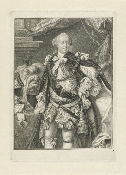Curator: Let’s turn our attention to this engraving from 1755, “Portret van Willem V, prins van Oranje-Nassau” by Pieter Tanjé. Editor: Immediately, I notice a tension—a rather formal setting depicting a child. There’s almost a weight of expectation emanating from this scene. Curator: Absolutely. Tanjé masterfully uses line and contrast in this piece. Observe the cascading drapery balanced by the linear architecture of the terrace—these contrasting elements contribute to the work's internal dynamics, subtly framing the central figure. Note the details in the ornamentation of his clothing: intricate patterns create focal points within the composition. Editor: Yes, the artist really is showing off a style in transition from Baroque, and the trappings of power, wealth and global awareness on this child. We must remember this boy, barely more than a toddler, represents an inherited position of immense political control in a rapidly changing colonial world. This image acts almost like propaganda, visually solidifying and normalizing hereditary power. Curator: While the inherent political and societal factors cannot be disregarded, it is the arrangement of symbols, as it relates to a tradition in the art of the Dutch Golden age that speaks volumes. Each emblem functions within a semiotic system where cultural meanings intersect. Editor: Agreed, this art embodies that visual system, reinforcing a specific and constructed identity. This child exists under immense historical expectations, shaped by, not apart from the world and history. We can consider this work's implicit social and political meanings in its construction, display, and consumption as critical parts of understanding. Curator: An astute observation. What resonates with me is that while societal power structures inevitably shift through time, this artist creates a compelling formal configuration. Editor: And how remarkable that such configurations so profoundly affect perceptions of personhood and identity across the ages!