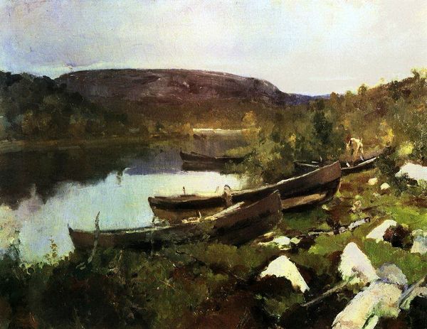 Curator: Ilya Repin’s "Landscape of the Volga with boats," painted in 1870, captures a specific moment along this iconic river. It is an early example of his exploration of plein-air techniques. Editor: Wow, my immediate impression is… tranquility. And a kind of stillness. It’s a quiet scene, despite what must be, in reality, a rather active waterway. Curator: Absolutely, that sense of quietude is really striking. Repin’s handling of light is particularly important. The way the gray sky seems to meet the water creates this hazy, almost dreamlike quality. This ties in well with the socio-political context too, especially after the serf emancipation. Editor: Tell me more. Curator: Well, this era saw a rise in artistic attention towards everyday life and the working classes. Though somewhat subtle, Repin offers glimpses into the lives of people dependent on the Volga, highlighting its critical role. The almost muted color palette echoes their lives: hard but also harmoniously connected with nature. The landscape becomes both witness and participant to their narratives. Editor: It's like the river embodies the possibilities and limits of their lives, both simultaneously. And those boats, their shapes so simple, become metaphors for journeys undertaken, dreams pursued, and the constraints placed on them by social structures. Curator: Exactly! Even his impasto technique enhances this reading: the way he renders the boats conveys movement, while their grounded position reveals realities of their life in Russia. Editor: You know, there's a vulnerability that I hadn’t immediately perceived. This piece makes me consider how environment shapes our shared experiences, and this artist, at least here, captures the nuance, in a deceptively subtle way. Curator: It's those undercurrents, literally and figuratively, that make Repin such a fascinating, resonant figure, I feel. And so often those undercurrents carry more significance. Editor: Indeed, something so peaceful hides multitudes. Thank you.