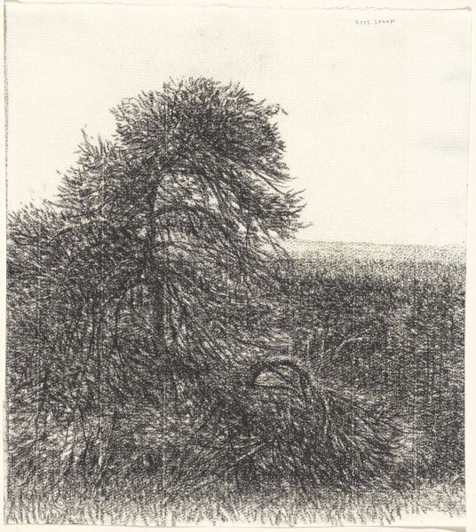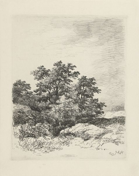Malcolm Cameron made this landscape scene with a printmaking technique, probably sometime in the mid-20th century. The image shows an almost gothic group of trees clustered together in a field, maybe even a graveyard. I love how the artist uses a mass of tiny, etched marks to describe the form and texture of the trees. The lines seem to accumulate into dark, shadowy masses, offset by areas of blank paper. Look at the upper part of the central tree. The artist has created a kind of halo effect by radiating marks outward, then dissolving them back into the pale sky. This technique builds a sense of depth and volume without relying on a traditional light source. Cameron's work reminds me a little of Whistler's etchings, with their understated, tonal approach and delicate line work. It's a good reminder that art is a conversation across time and generations, full of personal expression and inventive formal solutions.